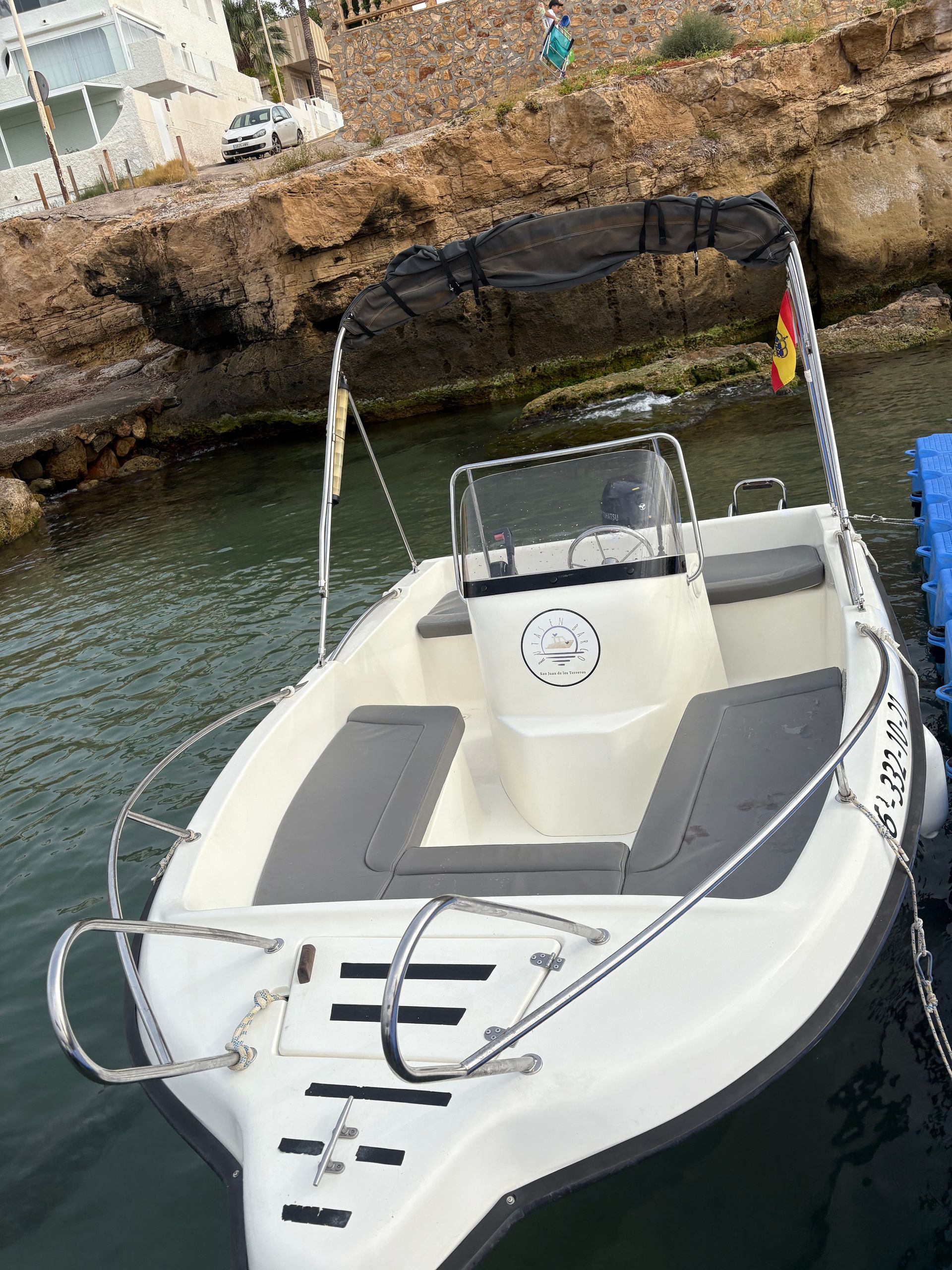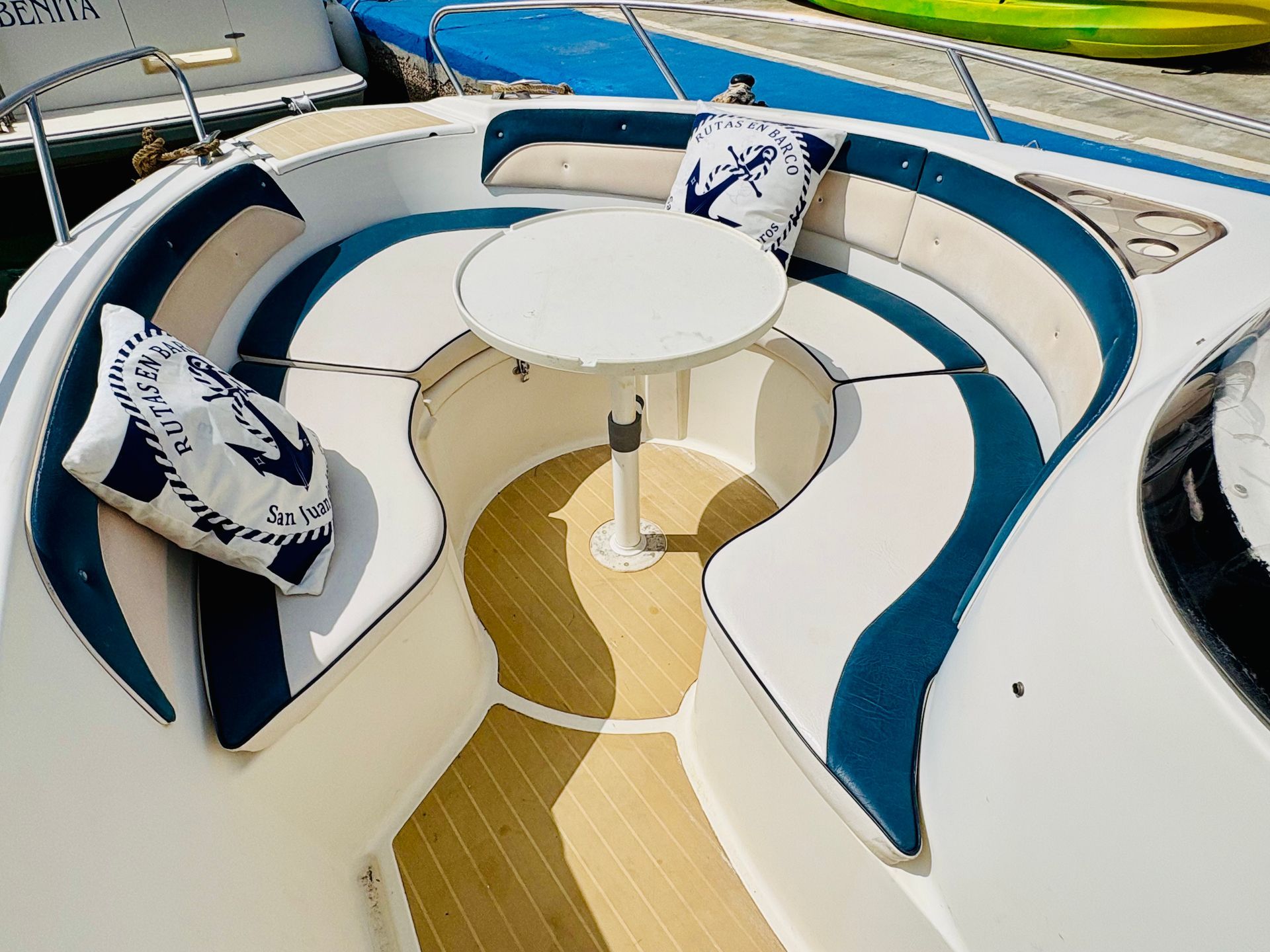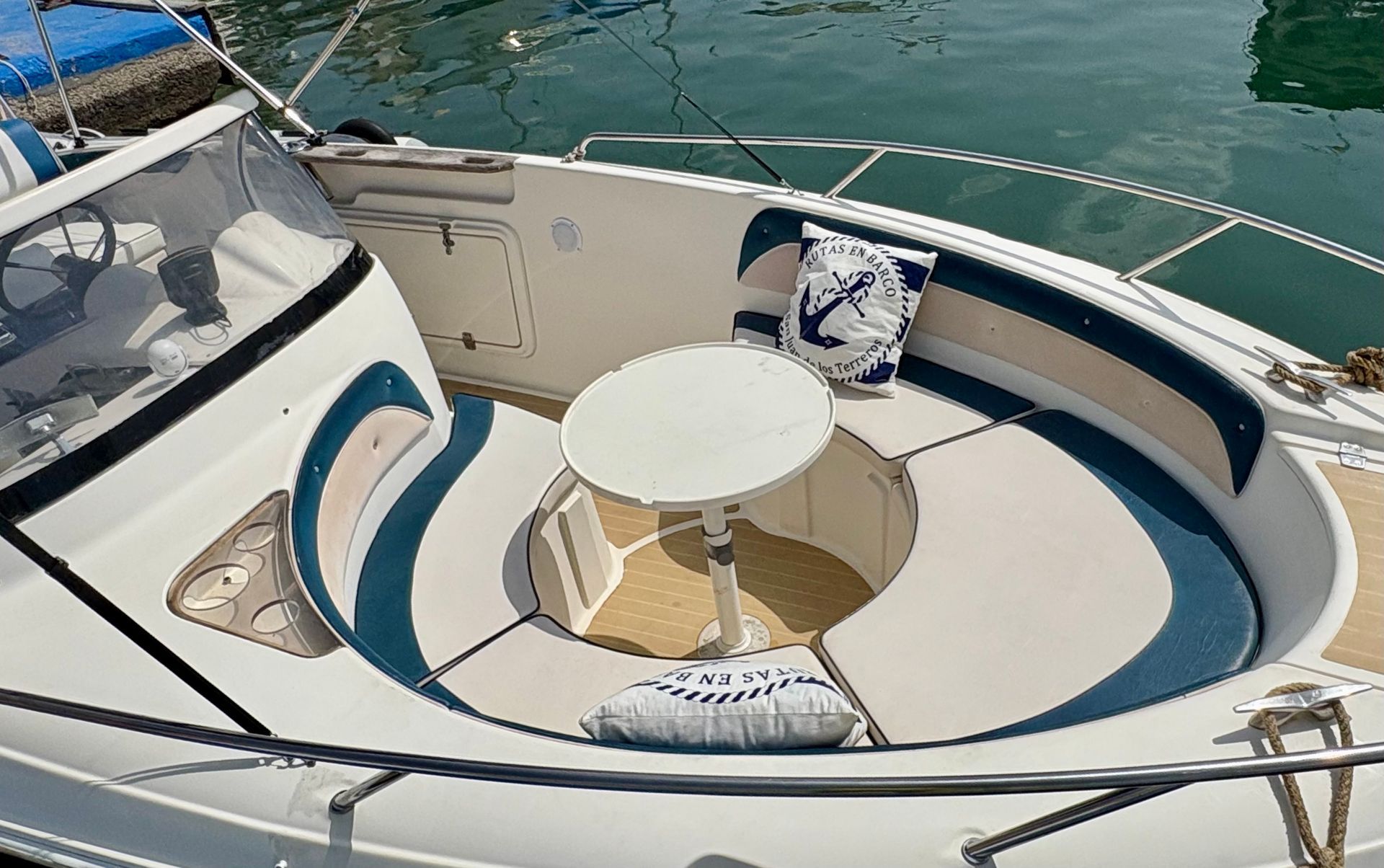 Equipado con motor potente de 115 cv, solárium, escalera de baño y bimini para sombra, es perfecto para explorar calas y playas con total seguridad y confort.