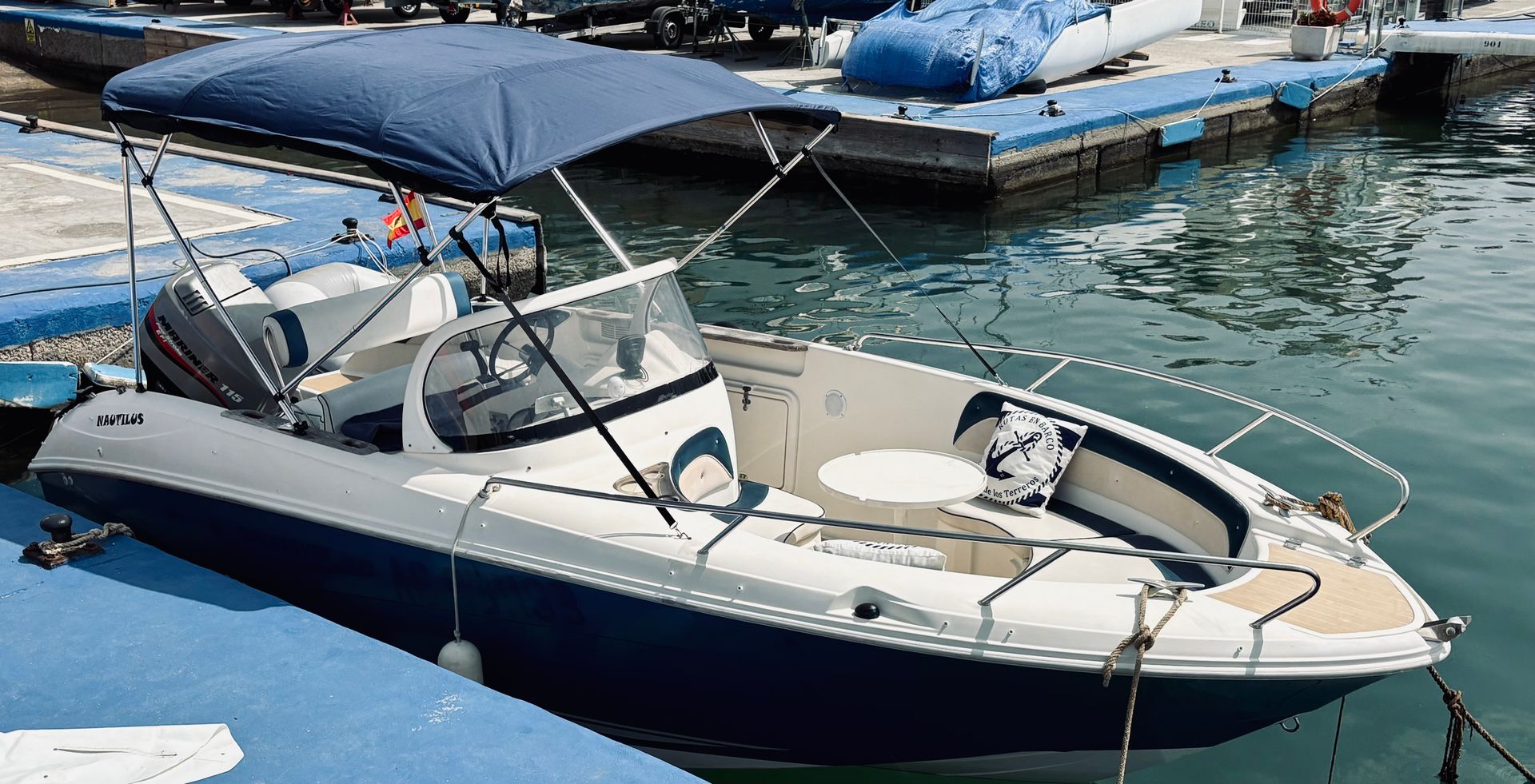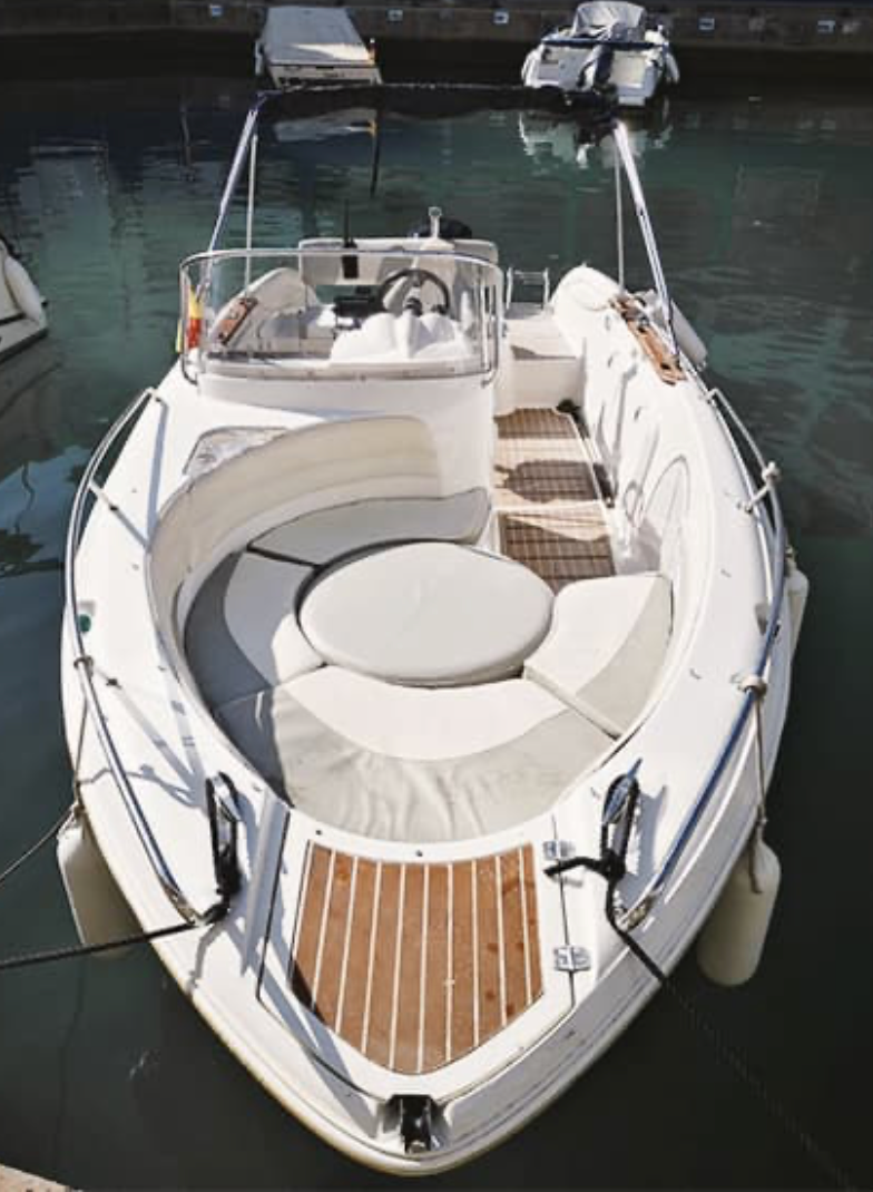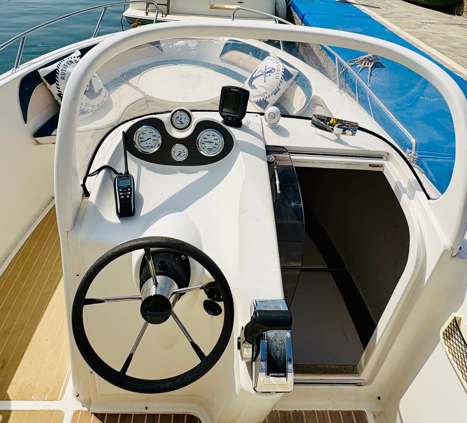 Equipado con motor potente de 115 cv, solárium, escalera de baño y bimini para sombra, es perfecto para explorar calas y playas con total seguridad y confort.