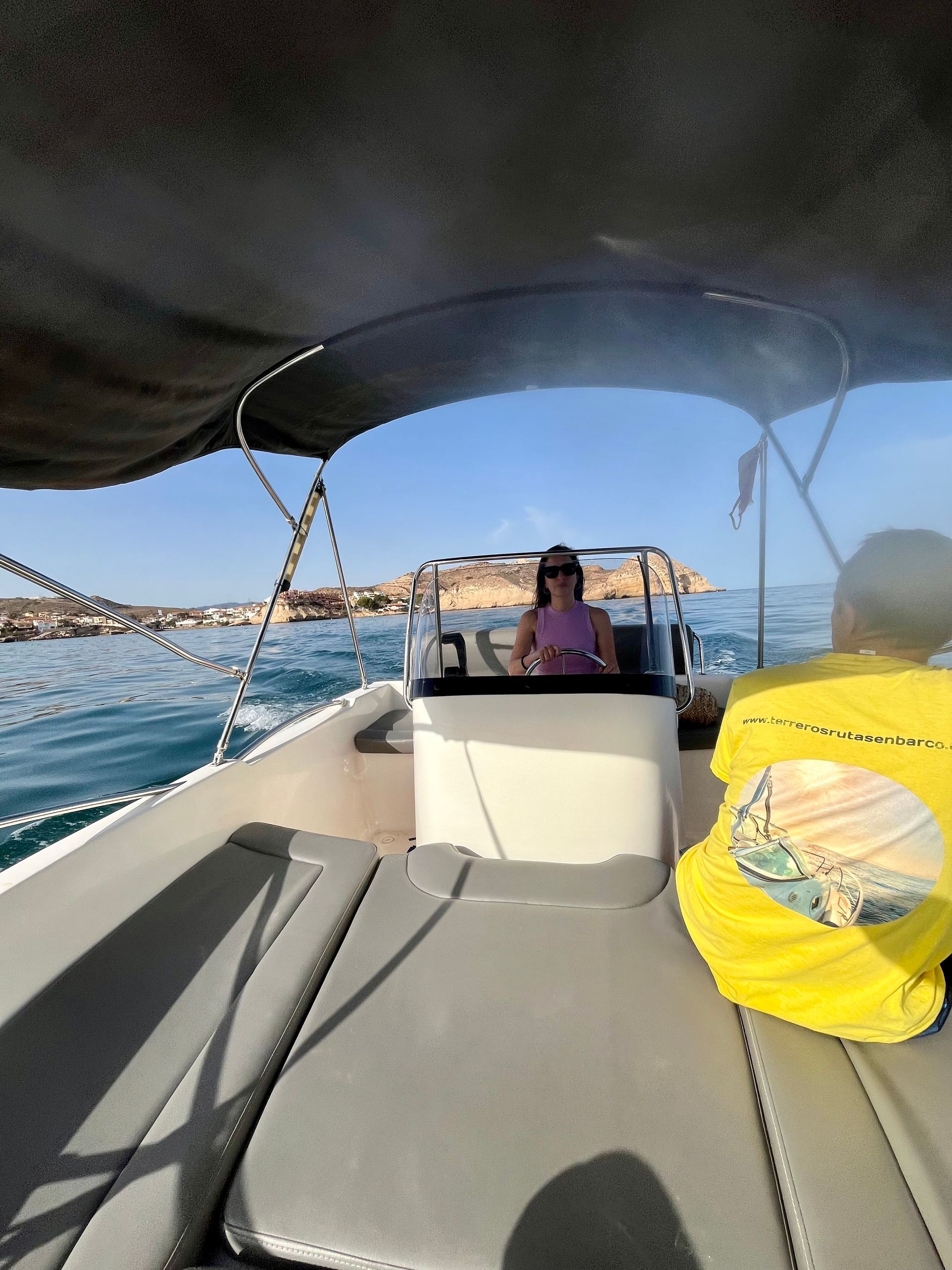 Estas preciosas embarcaciones son las más estables del mercado debido a su anchura, disponen de una cómoda escalera en popa para subir y radio mediante Bluetooth para hacer de tu estancia en Terreros unas vacaciones inolvidables.