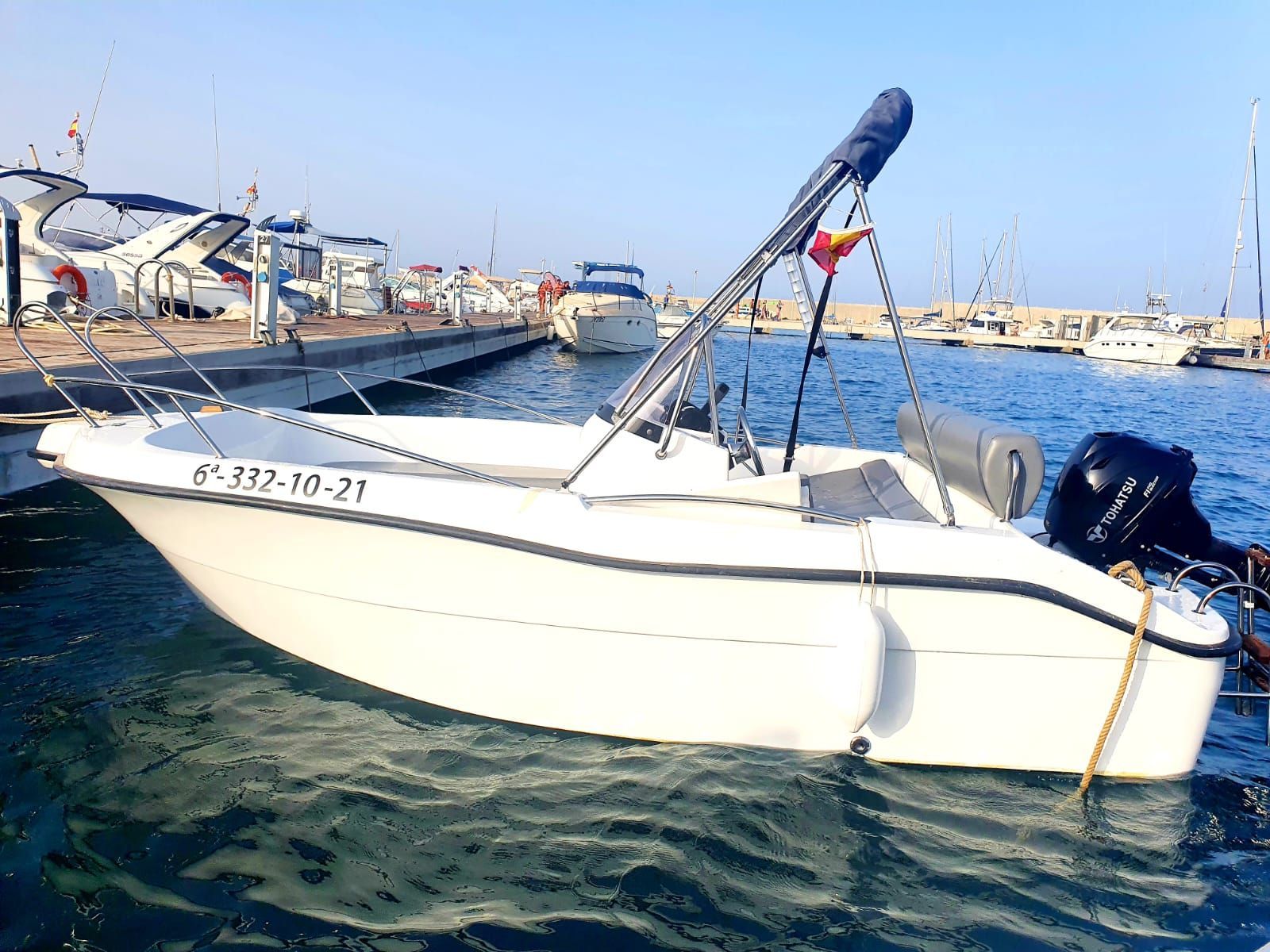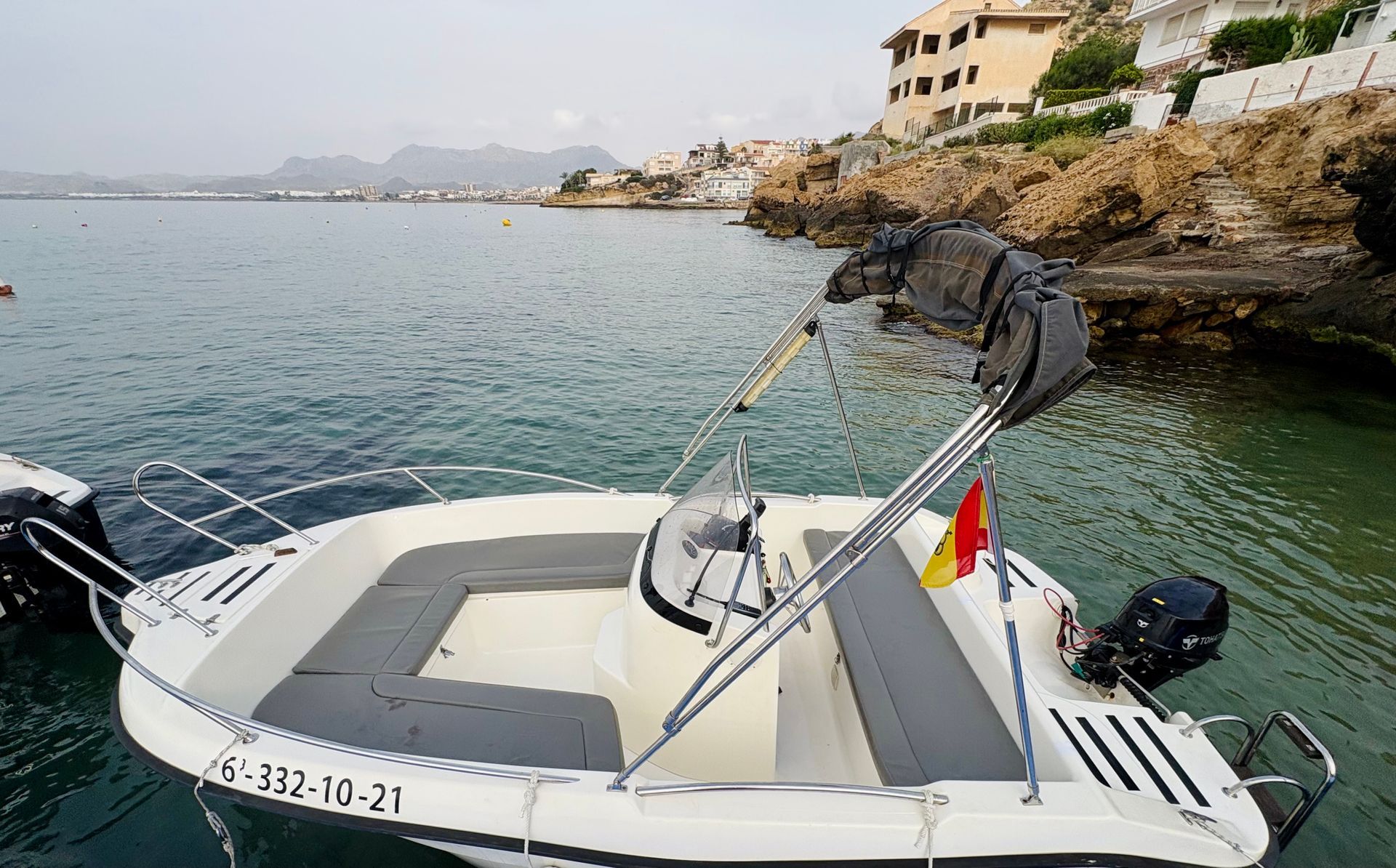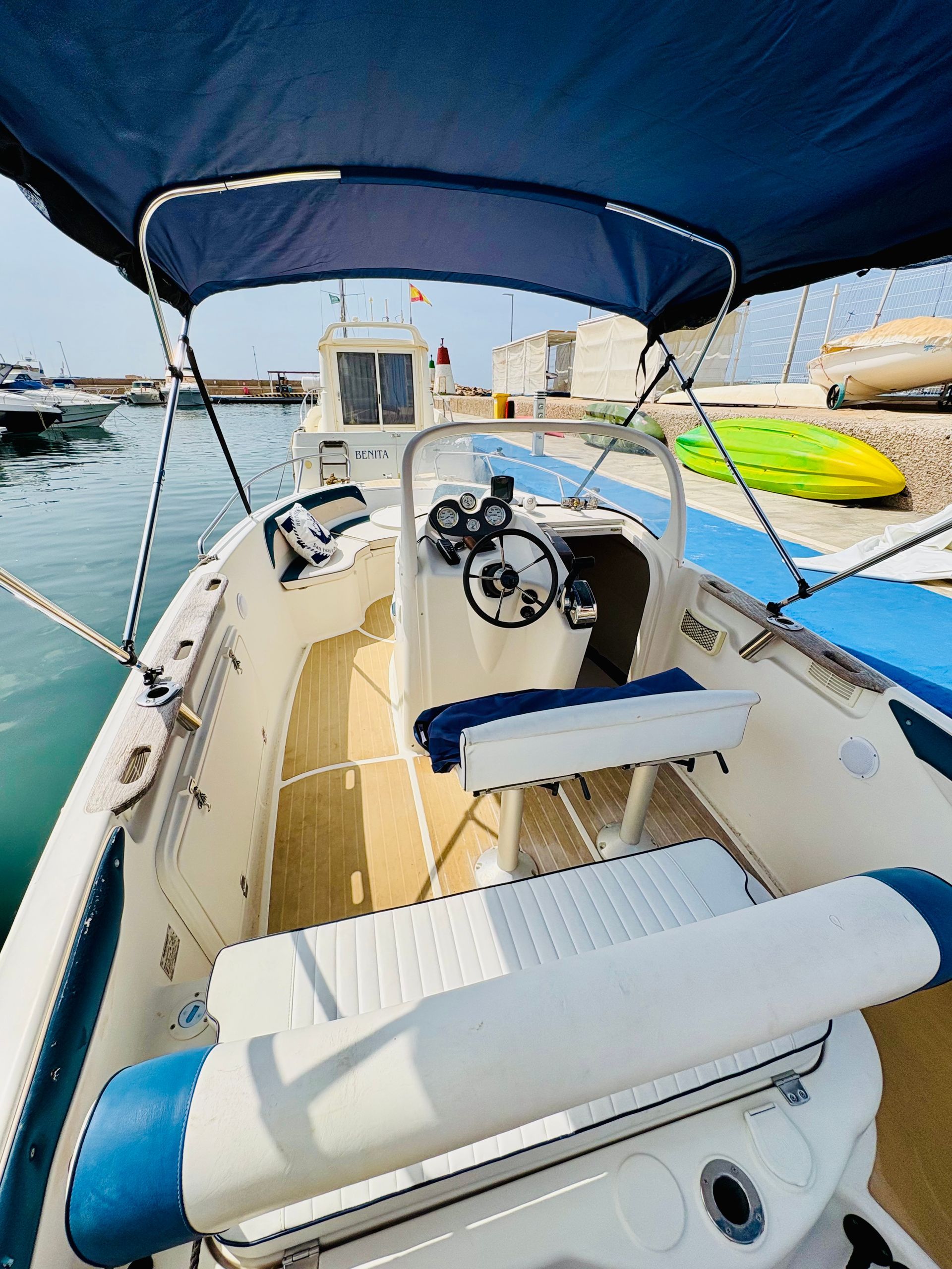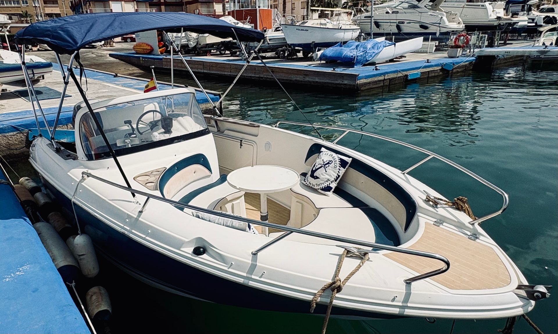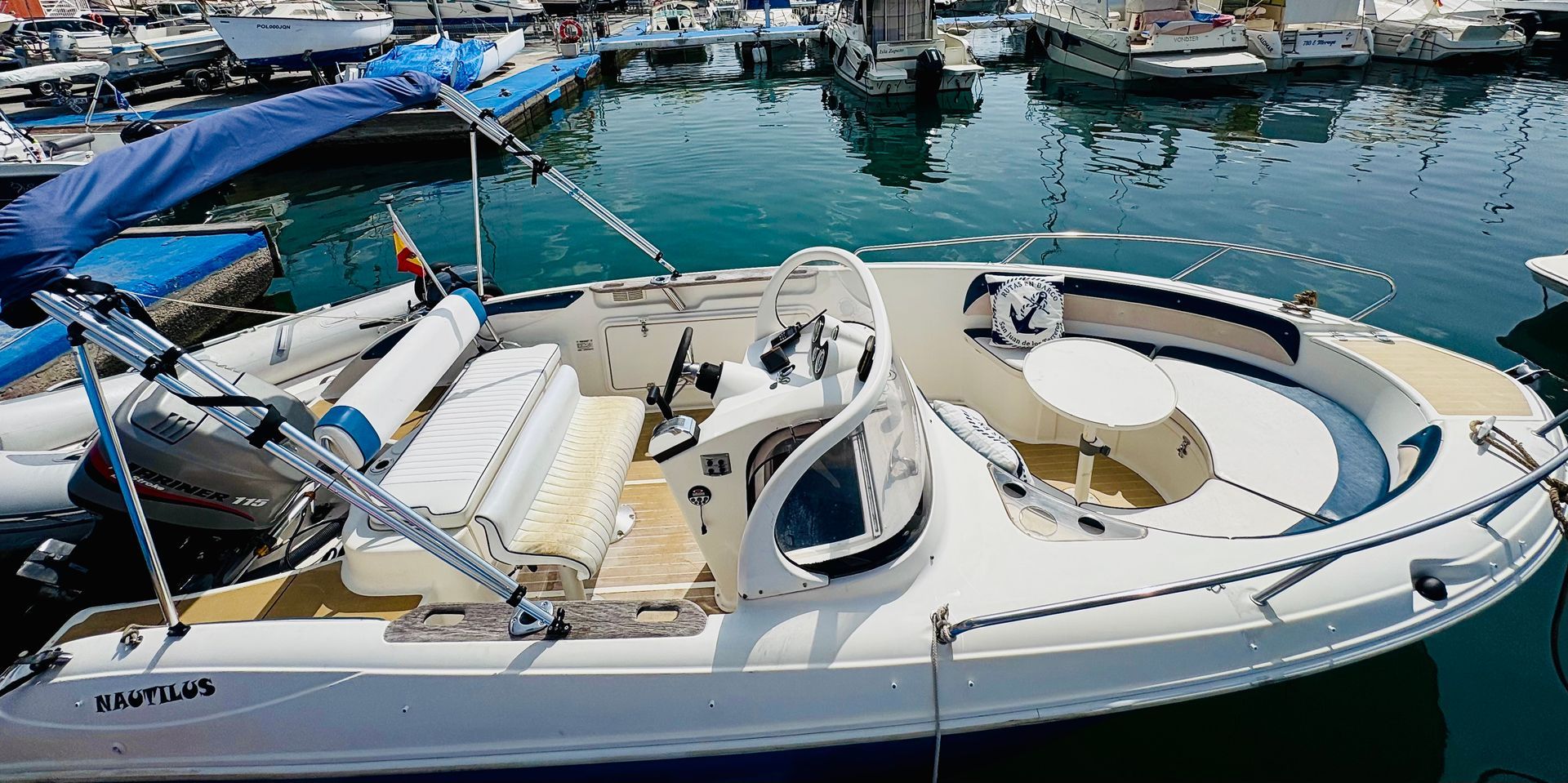 Equipado con motor potente de 115 cv, solárium, escalera de baño y bimini para sombra, es perfecto para explorar calas y playas con total seguridad y confort.
